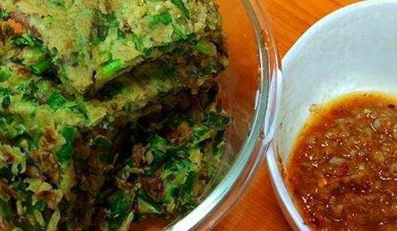 然后快速搅匀,放盐醋,醋不要太多,盖住蒜就行,主要以蒜为主,搅拌均匀刚烧过油的锅也不需要再放油了,烧热,小火,舀一勺面糊,摊平,稍等十几秒后转动锅让面饼均匀受热,当底下凝固了,可以用铲子把一边铲起来,滴入几滴油,把锅转一下,然后翻面饼,再转动锅让面饼均匀受热,两面上色后取出,然后继续下一个装盘,舀一碗稀饭沾着料汁真是太好吃了