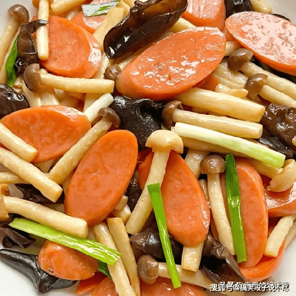 准备食材:火腿,白玉菇,蟹味菇,木耳,葱蒜,生抽,蚝油,食用油,食盐。