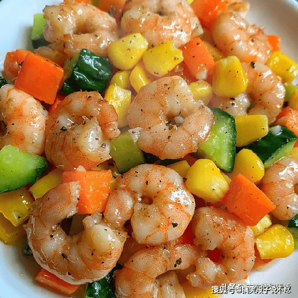 4、锅留底油,放入蒜末翻炒爆香,倒入胡萝卜丁、黄瓜丁、玉米粒,翻炒均匀后倒入虾仁,翻炒均匀。