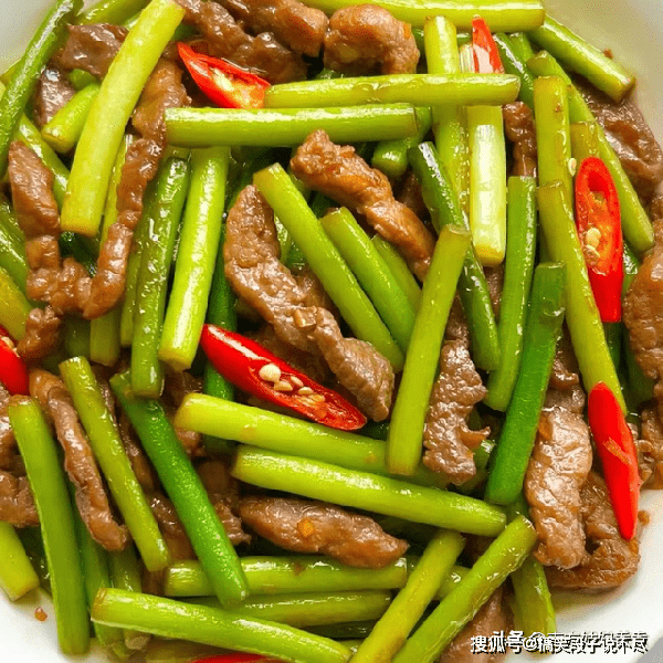 准备食材:蒜薹,猪里脊肉,小米辣,蒜,料酒,生抽,老抽,淀粉,食盐,食用油。