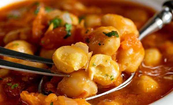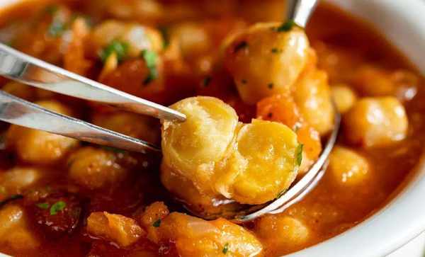 咕嘟咕嘟,汤底愈发浓稠,香味愈发浓烈,鹰嘴豆煨煮得烂而不散,窝在红润的汁水里。