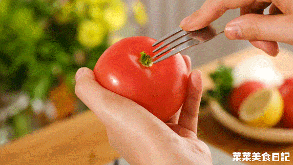 3.叉子插入番茄,放在煤气上小火烤至皮开裂,撕掉