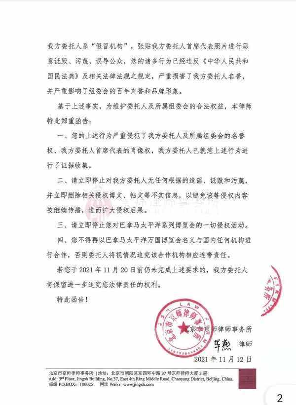 为此,还在官网贴出组委会主席的声明,称自己才是在中国的唯一合法机构,至2016年以来已举办过6届万国博览会,还指责“巴拿马万国博览会(旧金山)”骗取企业信任、肆意敛财、歪曲事实。