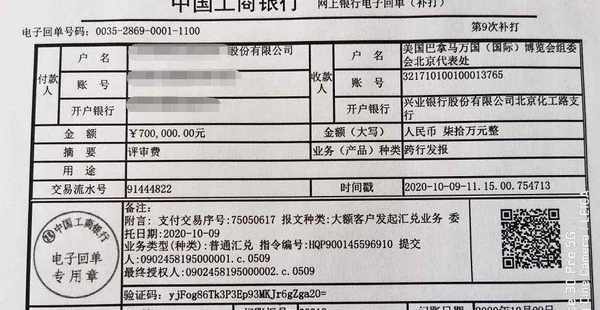 而从回执单所示内容来看,“评审费”为人民币700000元。