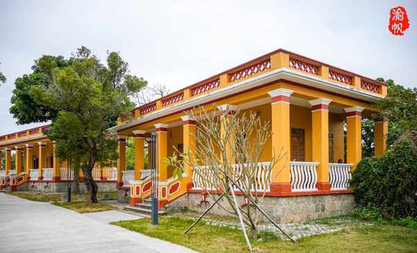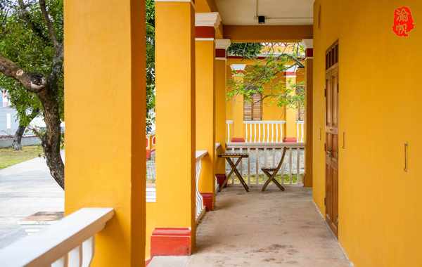 黄色与红色的色彩搭配很是醒目,让人一看就有想去拍照的冲动,随便在走廊上一靠,又或者往白色的栏杆外伸出头来,再借一点绿树红花作为前景,随手一拍就是不错的照片。
