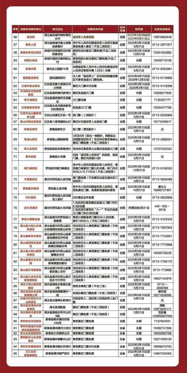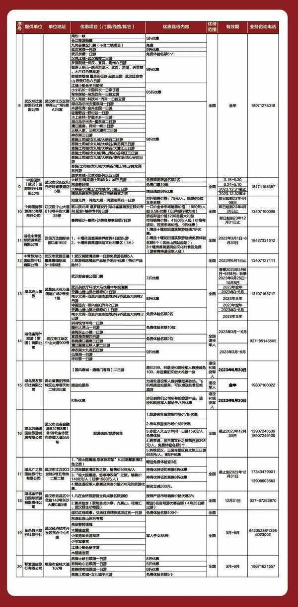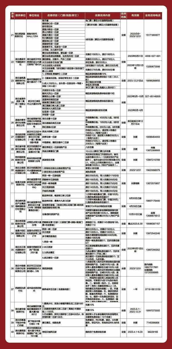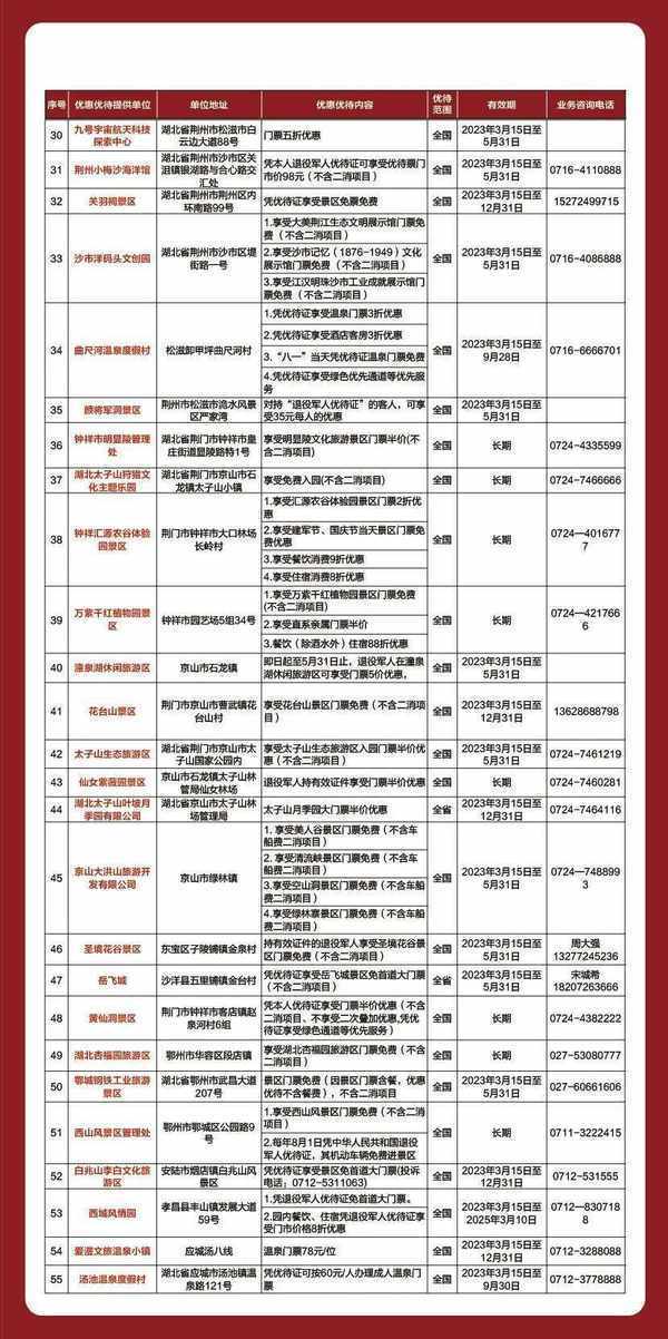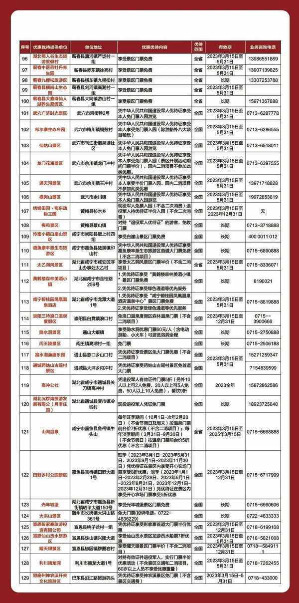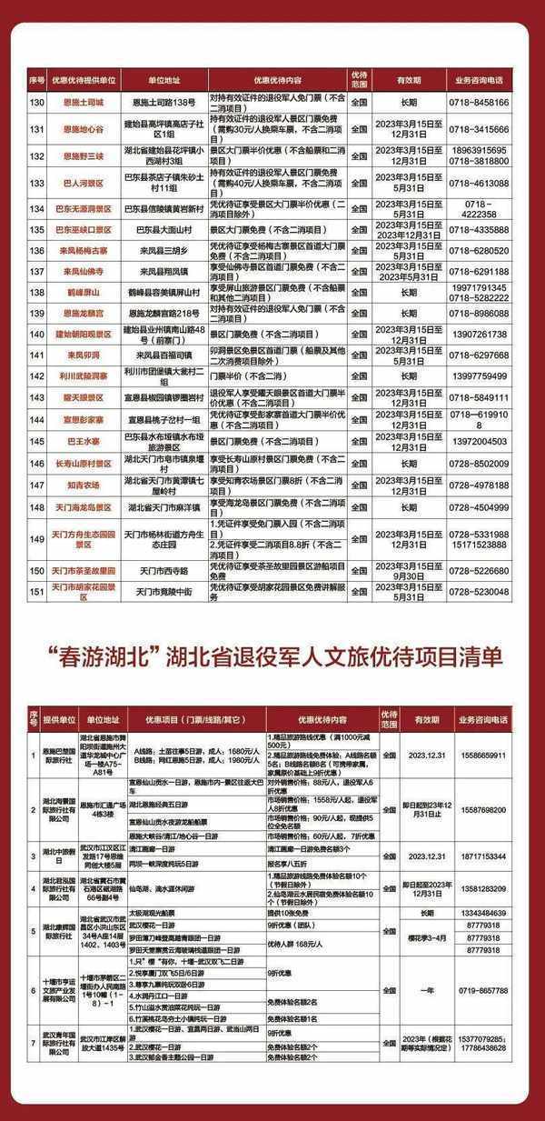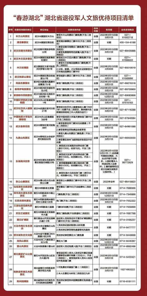 据悉,为配合开展2023年退役军人“春游湖北”系列活动,省退役军人事务厅会同省文旅厅发动全省各地景区、旅行社积极参与,各景区、旅行社与省退役军人事务厅签订服务保障承诺书,为退役军人提供优惠优待服务。