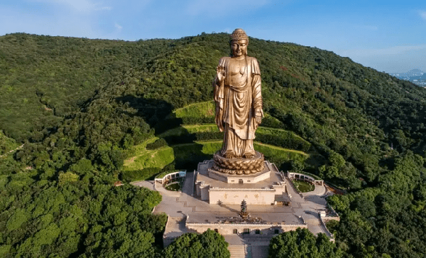 位于无锡市滨湖区马山镇灵山路1号。是世界上最高的露天青铜佛陀像,大佛慈颜微笑,广视众生,右手施与愿印代表给予快乐,胸前记号代表万德庄严,每年的公历和农历新年前夜,灵山都会举行都撞钟晚会。