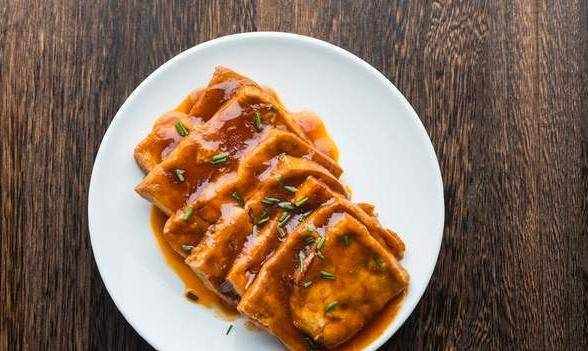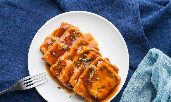 5.用锅内剩余的食用油重新加热,然后倒入调好的糖醋汁,加热至沸腾,然后倒入炸好的豆腐炒至汤汁浓稠,最后用大火至收汁,即可食用。