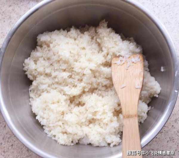 3.准备一个干净无水无油的容器,将蒸好的糯米倒入容器中,待糯米冷却至约30℃。30度,加入250克冷白米,揉搓米,再加入3克甜酒曲拌匀,压平,中间戳个洞,观察出酒情况。