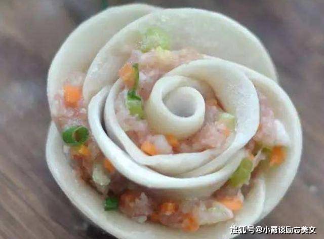 第五步:将饺子皮底部对折,然后将饺子皮从左向右卷起,用力压住嘴巴,立正成玫瑰花状。