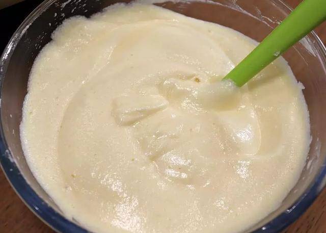 第四步:蛋清打至呈奶油状顺滑,然后倒入蛋黄,再倒入适量的面粉,搅拌至没有气泡。