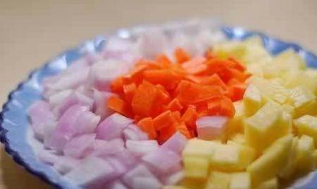 土豆、红萝卜、洋葱去皮洗净切成小粒。