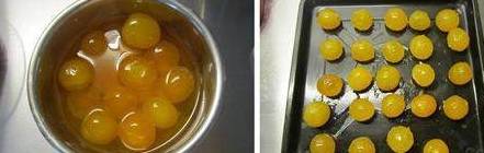 2】咸蛋黄喷白酒,180度预热好的烤箱烤5分钟,不要烤出油,莲蓉分12份。咸蛋黄可以直接买咸鸭蛋黄用。