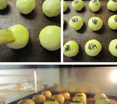 5】擀卷好的面皮两头对起来,不规则的边缘收到中间再按扁。放一个莲蓉蛋黄馅,虎口向上收拢,整理好,收口朝下,放烤盘,表面刷蛋液,每个再撒少许黑芝麻