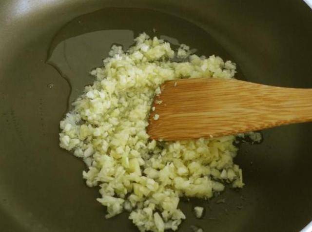 第五步:在平底锅中加热油。油烧开后,加入蒜末翻炒,不断搅拌,直到散发出香味。然后倒入适量的蚝油,边不断搅拌边炒匀。