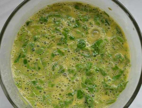 第四步:将切好的普丁和大葱倒入蛋液中,撒上适量的盐搅拌均匀备用。