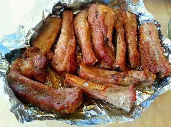 2、排骨腌好后,将锡纸剪成合适大小,哑光的一面朝上,放上排骨,用锡纸包起来,每个单独包住;