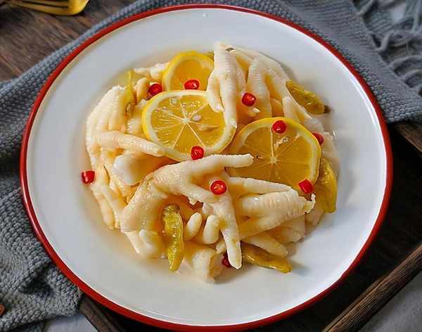 食材:鸡爪500克、泡椒100克、柠檬1个、花椒1把、红辣椒3个、生姜4片、葱1棵