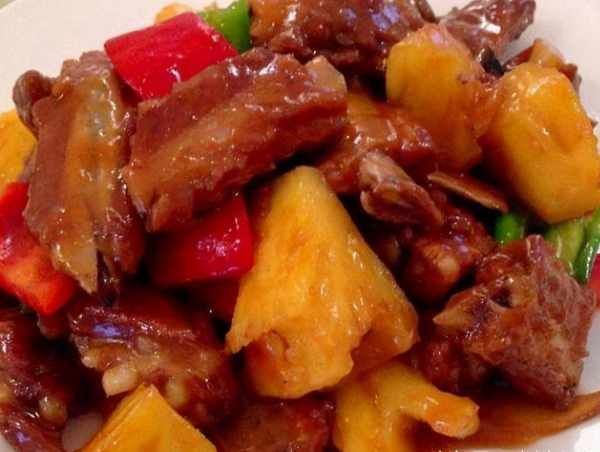 4、倒入之前调好的番茄酱汁;再次汤汁收浓;倒入菠萝、青红椒;翻匀,即可出锅;小贴士:因为在烧排骨时放了冰糖,所以番茄酱汁中没有再放糖,如果之前没放冰糖,番茄酱汁需要放一到两匙糖来调整酸甜度。