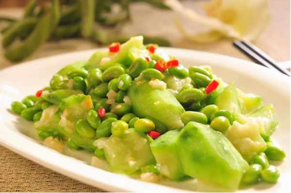 食材:丝瓜、毛豆、盐、大蒜、植物油、淀粉、小米椒