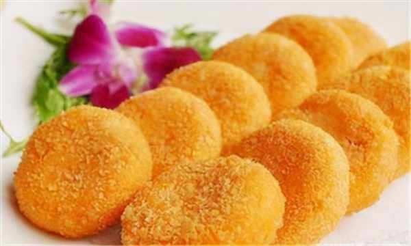 9.将锅烧热,放入适量的油,转小火,将圆球压瘪放入锅中
