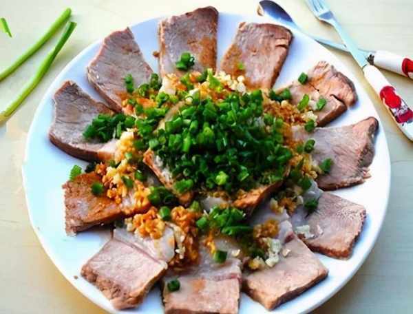 4. 肉切好片,切上一盘,将蒜末撒在切好的肉片上,再淋上酱油和少许盐。