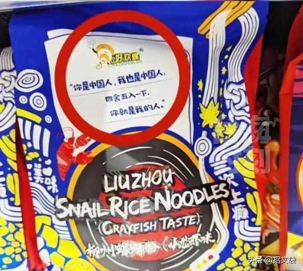来自广西柳州的螺蛳粉品牌“好欢螺”,在其销往台湾省的产品包装上,写了一句欢乐的话“你是中国人,我也是中国人,四舍五入一下,你就是我的人”。