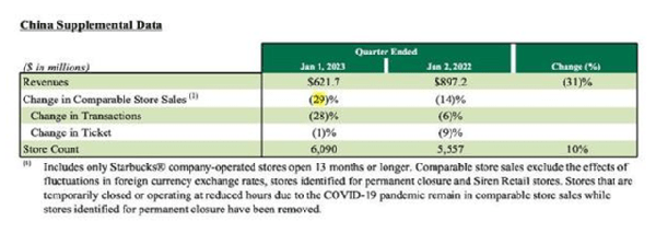 疫情期间,星巴克中国同店销售额下降29%,同店交易量下降28%,平均客单价下降1%。财报显示,截至2023年1月1日三个月内,星巴克中国市场营收6.217亿美元,同比下跌31%。