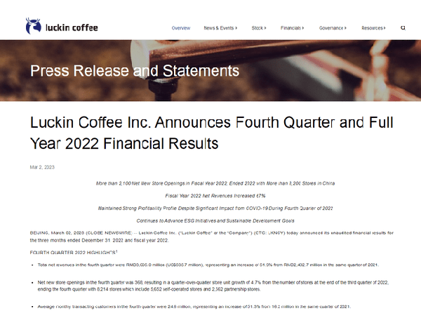 对于2022年第四季度净利润锐减,瑞幸咖啡指出,其与美国证券交易委员会(SEC)就此前财务造假的指控达成和解,按照协议缴纳了约11.465亿元罚款。
