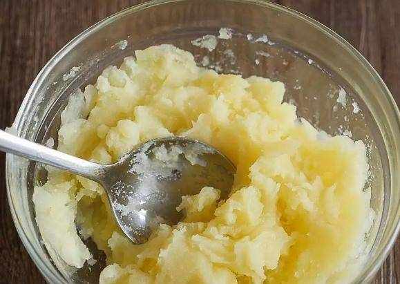 第二步:取出蒸熟的土豆捣成更细的土豆泥,然后取适量的土豆泥放在手上搓成小圆球。