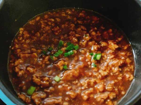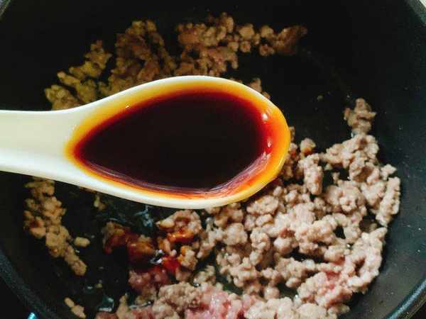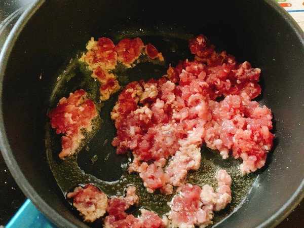 3、起锅烧油,下入肉末,炒至肉末变色。