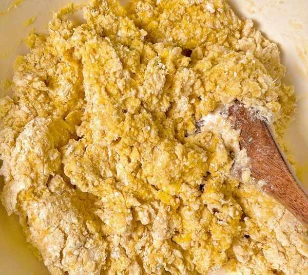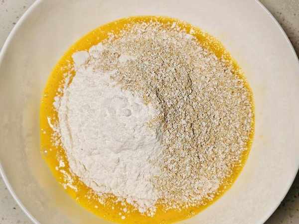 3、把面粉和燕麦麸倒入蛋液中,再加入适量的盐和鸡精,搅拌均匀成絮状。