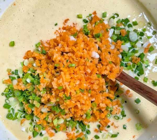 6、面糊活好以后,倒入切好的胡萝卜丁和葱花,搅拌均匀。