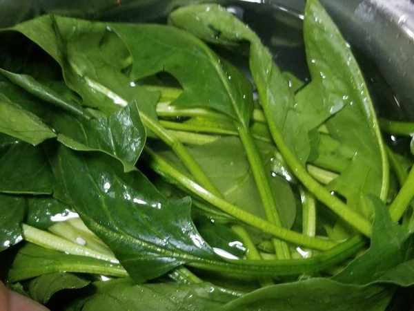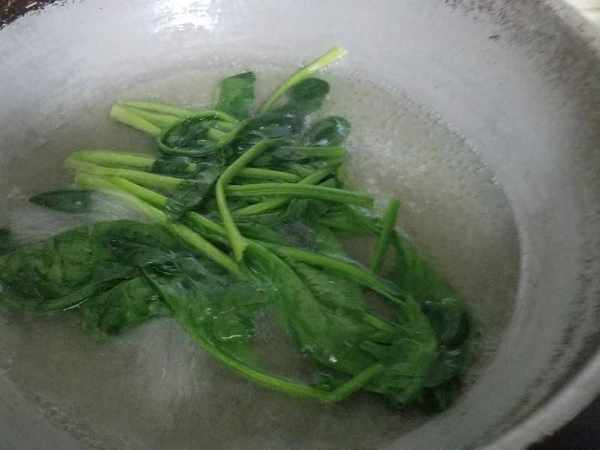 2、锅里烧开水,加入少许盐和几滴油,再下入菠菜,焯煮片刻,捞出,沥干水分。(菠菜一定要焯水,因为它里面含有草酸,草酸摄入体内会与体内的游离钙结合,使钙无法吸收,焯烫一下可以把草酸烫掉。加盐和油,则可以保持菠菜的翠绿,不容易变老)