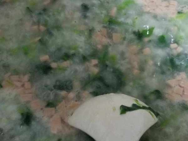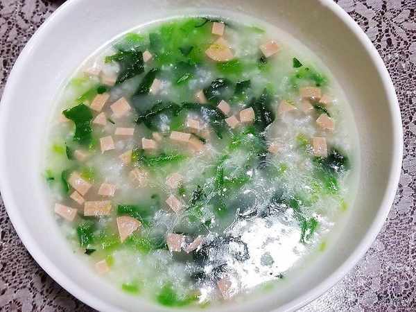 材料:大米粥1碗,菠菜2棵,火腿肠1根,盐适量,香油几滴。
