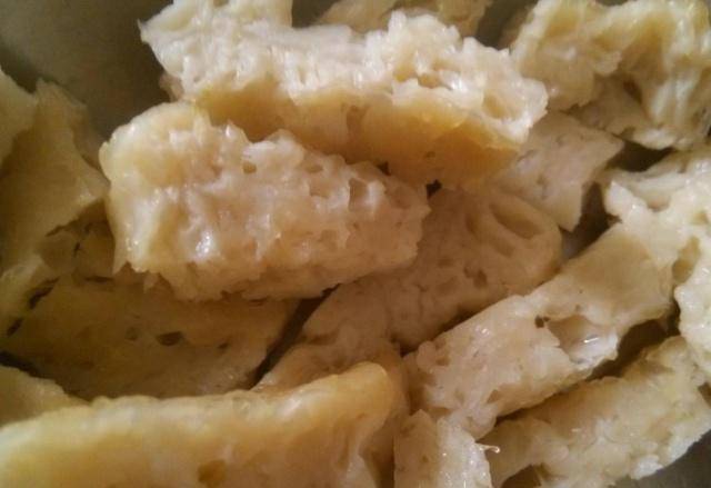 2.起泡后揉匀,准备一碗水洗脸。一开始水很浑浊,面筋越细越粘。然后将洗脸水过滤到另一个容器中,继续洗面筋,直到水不再浑浊时,面筋就洗干净了。我们把洗净的面筋放入蒸锅中,用大火蒸半个小时左右,面筋就蒸好了。