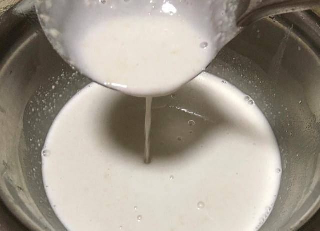 很多人做的凉皮开裂不劲道,就是因为淀粉糊太稠了。面筋分层后,水不要全部倒在上面,留一点,搅拌均匀。这样做出来的凉皮很结实,不会开裂。