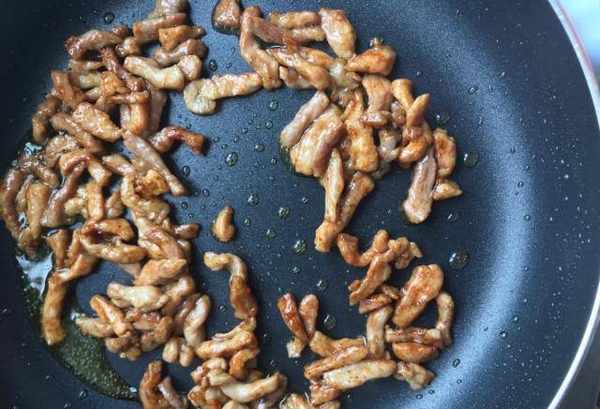 第三步:锅烧热,倒入适量油,油热后放入肉丝炒至颜色变白,加少许老抽上色,翻炒均匀,装盘在旁边。