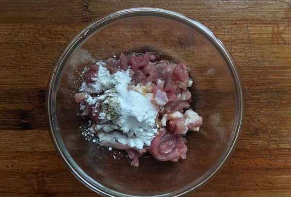 第二步:猪肉切丝,放入碗中,用料酒、生抽、盐、胡椒粉、淀粉腌制。