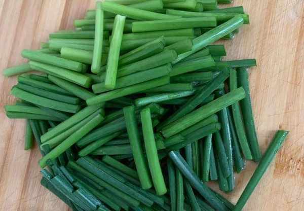 第1步:选择韭菜苔时,选择翠绿色的标本。韭花含苞待放,盛开的花朵其实并不嫩。买回来后,将头尾洗净,切块。
