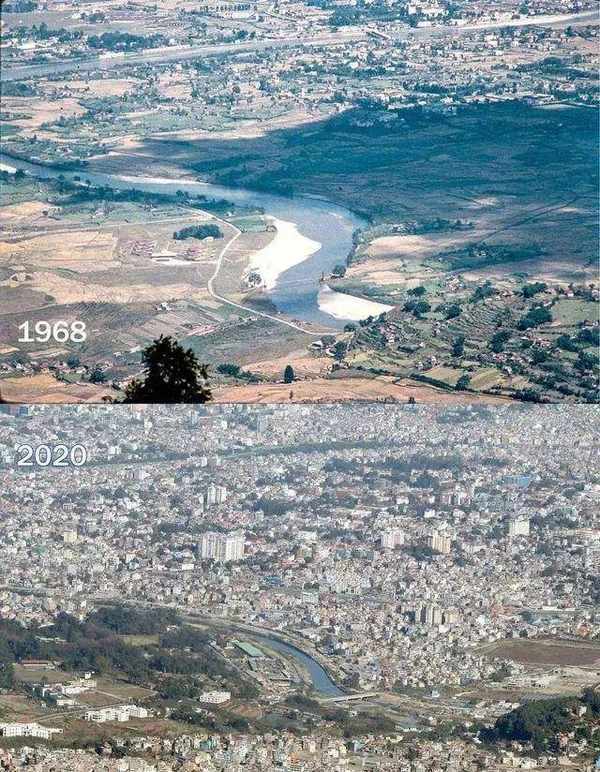地点:尼泊尔加德满都市,时间:上图1968年,下图2023年