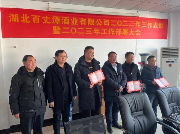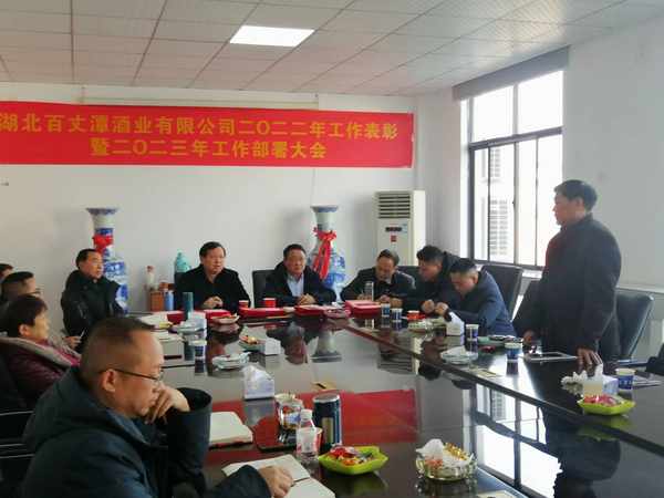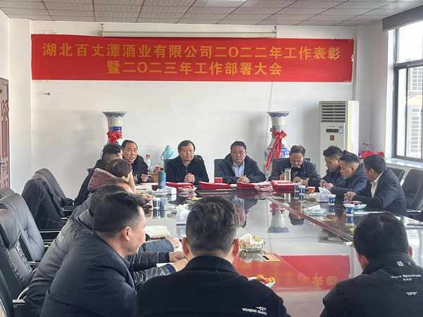本网讯 (通讯员郁林报道)2023年1月18日,湖北百丈潭酒业隆重举行2022年工作表彰暨2023年工作部署大会,会上总结了2022年度工作,表彰了28名生产、销售和管理先进工作者,并对2023年度工作进行了分工和部署。