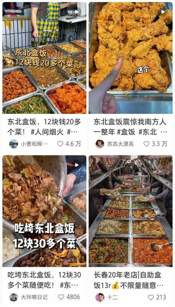 某平台上的东北盒饭。随着“盒饭流”短视频风潮一路南下,人们发现,便宜好吃的盒饭并不是东北的专利。在中国大大小小的城镇,都不乏低价快餐的身影。街头盒饭和乡村大席菜席卷全网,用事实告诉这届都市青年什么才是真正的物美价廉。