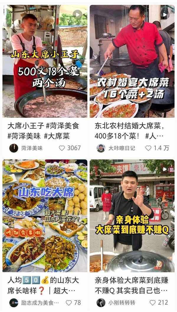 在粤西,一桌酒席少不了白切鸡、发菜猪手,在山东,葱拌牛肉、酱香肘子频频上镜,在东北,菠萝咕噜肉、梅菜扣肉也被端上了桌。这就是大席菜的气质,加工质朴成品却不粗糙,具有地方特色又不拘泥于某个菜系,便宜实惠,浓汤赤酱,滋味鲜活。网友纷纷表示,眼前的料理包瞬间不香了,真想回农村老家,认认真真吃一场席。