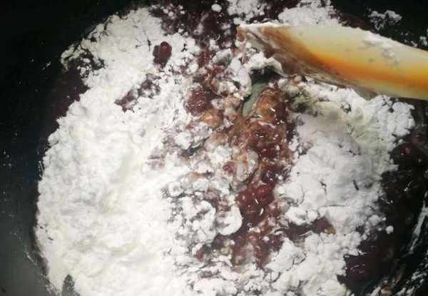 第二步:在煮好的红豆中加入70克白糖和100克木薯粉拌匀。木薯粉要趁热加入糊化,否则会沉淀成一层。