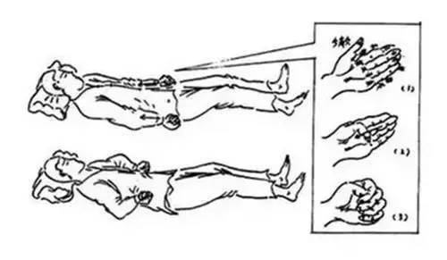 床上仰卧,双手、双腿伸直,手心朝上贴近腿部。