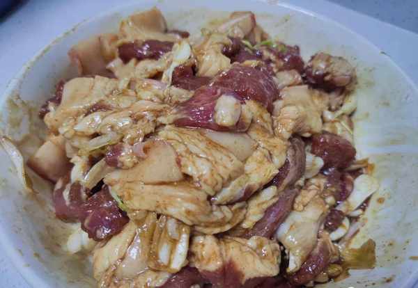 这就是我们已经处理好后的肉,然后放着腌。腌的时间越长,会更加入味;