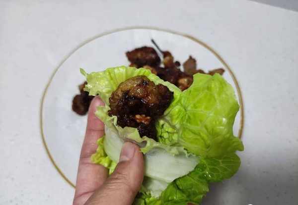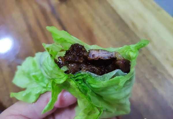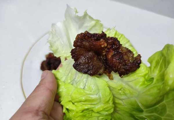 猪肉的表皮已经被炸得非常的酥脆,所以猪皮吃起来也是嘣嘎脆。然后我们取出一块生菜,将生菜上面放上两三片肉,用手给它折起来包好放入嘴里。那真的是一口又鲜又脆又香的三层肉包,非常的好吃,而且一点都不会油腻,这种吃法的话既有菜又有肉,营养也均衡,也特别容易饱腹。