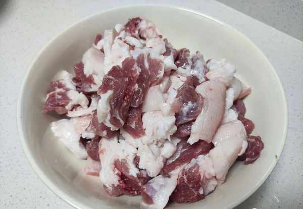 1.买回来的肉洗干净,洗好后的肉放在案板上,用刀给它切小片,切的时候最好要连同肥肉一起切,有肥有瘦,这样子煮出来才好吃,切薄片之后给它放在盆里面;