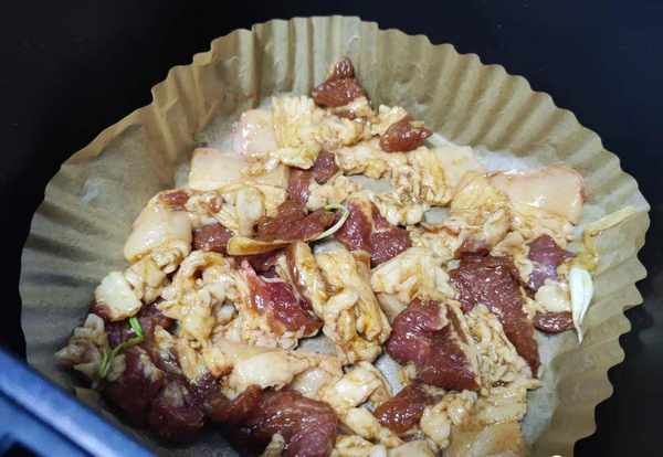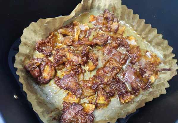 3.取出空气炸锅上面放上一层油纸,也可以直接用锡纸盘,然后把肉放在上面,均匀地摊开。摊开之后放入空气炸锅,用180度的烤个20分钟,在烤的过程中就可以闻到一股香味,还有肥肉煸油脂,吱吱响,很是解压;
